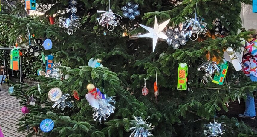10.12.2025Kinder schmücken Weihnachtsbaum mit Schmuck aus recycelten Materialien