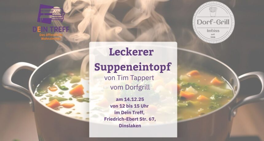 Das Team der Diakonie im Ev. Kirchenkreis Dinslaken öffnet das "Dein Treff - das öffentliche Wohnzimmer diesmal ausnahmsweise auch an einem Sonntag. Am 14.12.25 von 12 bis 15 Uhr schenkt Tim Tappert vom Hiesfelder Dorfgrill an der Friedrich-Ebert Str. 67 in Dinslaken kostenlos leckere Suppe aus. Wer mag, kann einfach vorbeikommen.