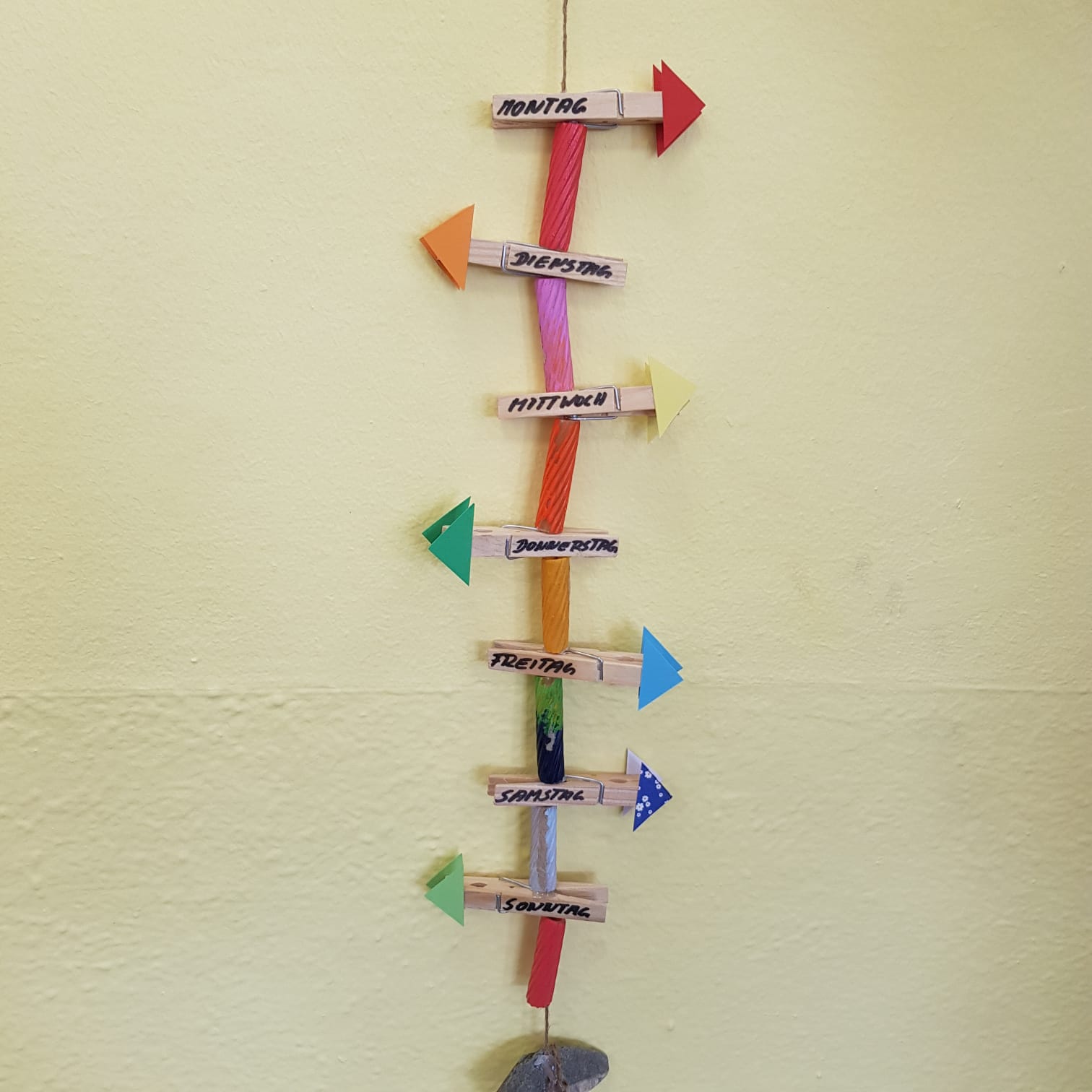 Inmitten von bunten Schnipseln, Scheren, Stiften & Co. wurde ein farbenfroher Wochenplaner gestaltet. Mit bunten Nudeln als Abstandhalter und den aufgefädelten Klammern hat man immer einen klaren Überblick für die kommende Woche: