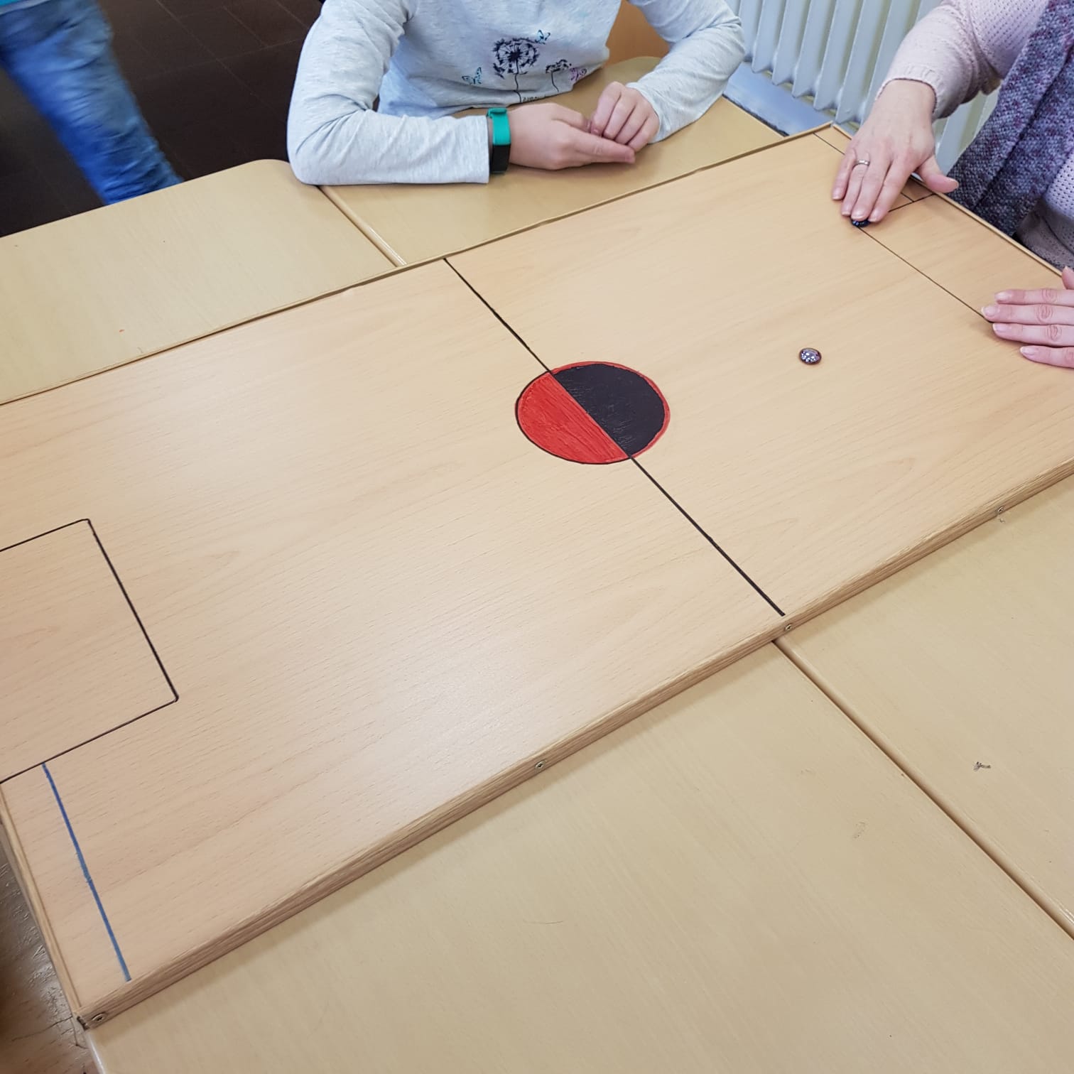 Die Betreuer:innen haben hier zusammen mit den Kindern ein Spielfeld gebaut, es wurde gesägt, gebohrt und gezeichnet.