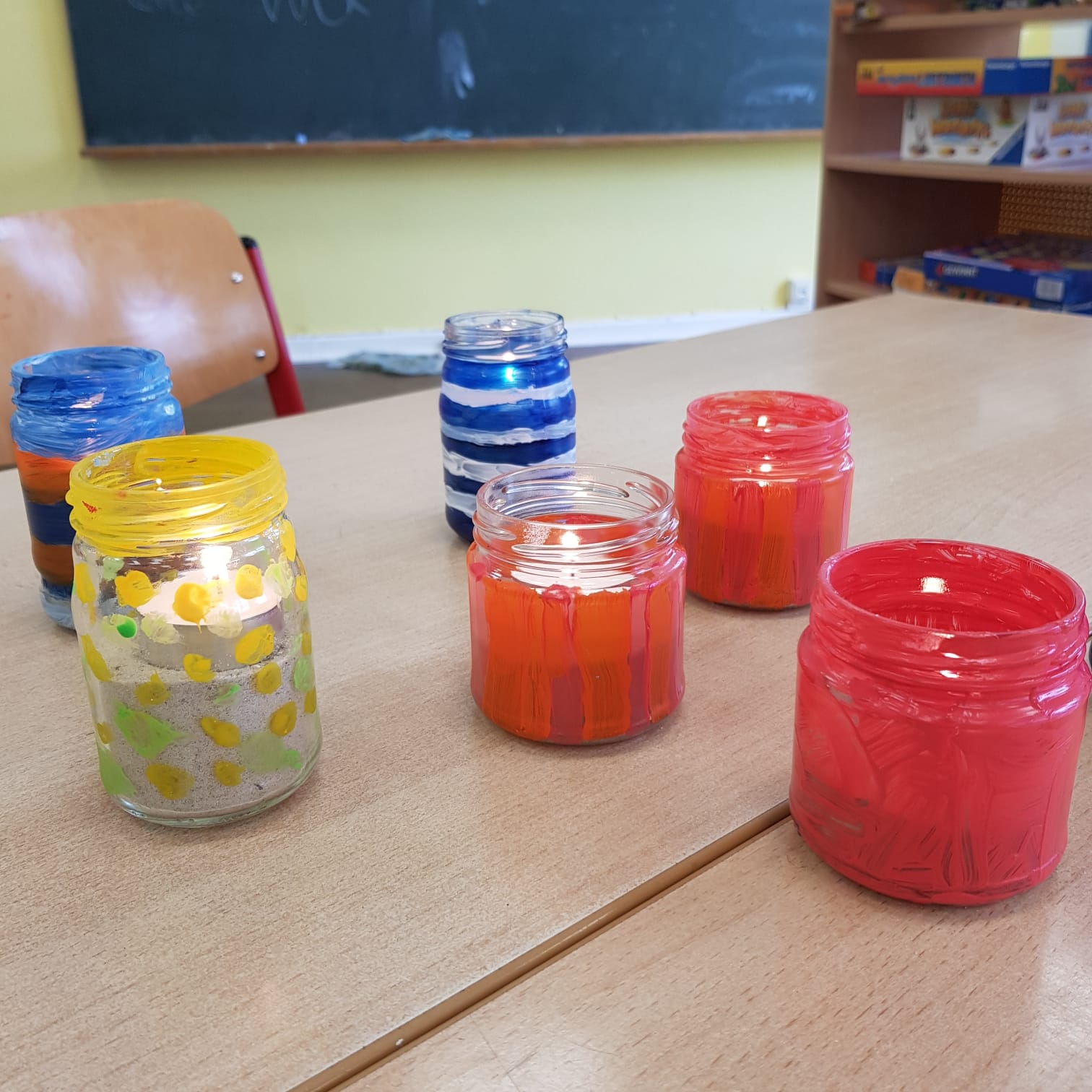 Auch hier haben die Kinder einmal mehr bewiesen, dass es Ihnen nicht an Einfallsvermögen fehlt, aus eigentlich geplanten Sanduhren wurden kurzerhand schön verzierte Teelichter zum Verschenken und Dekorieren: