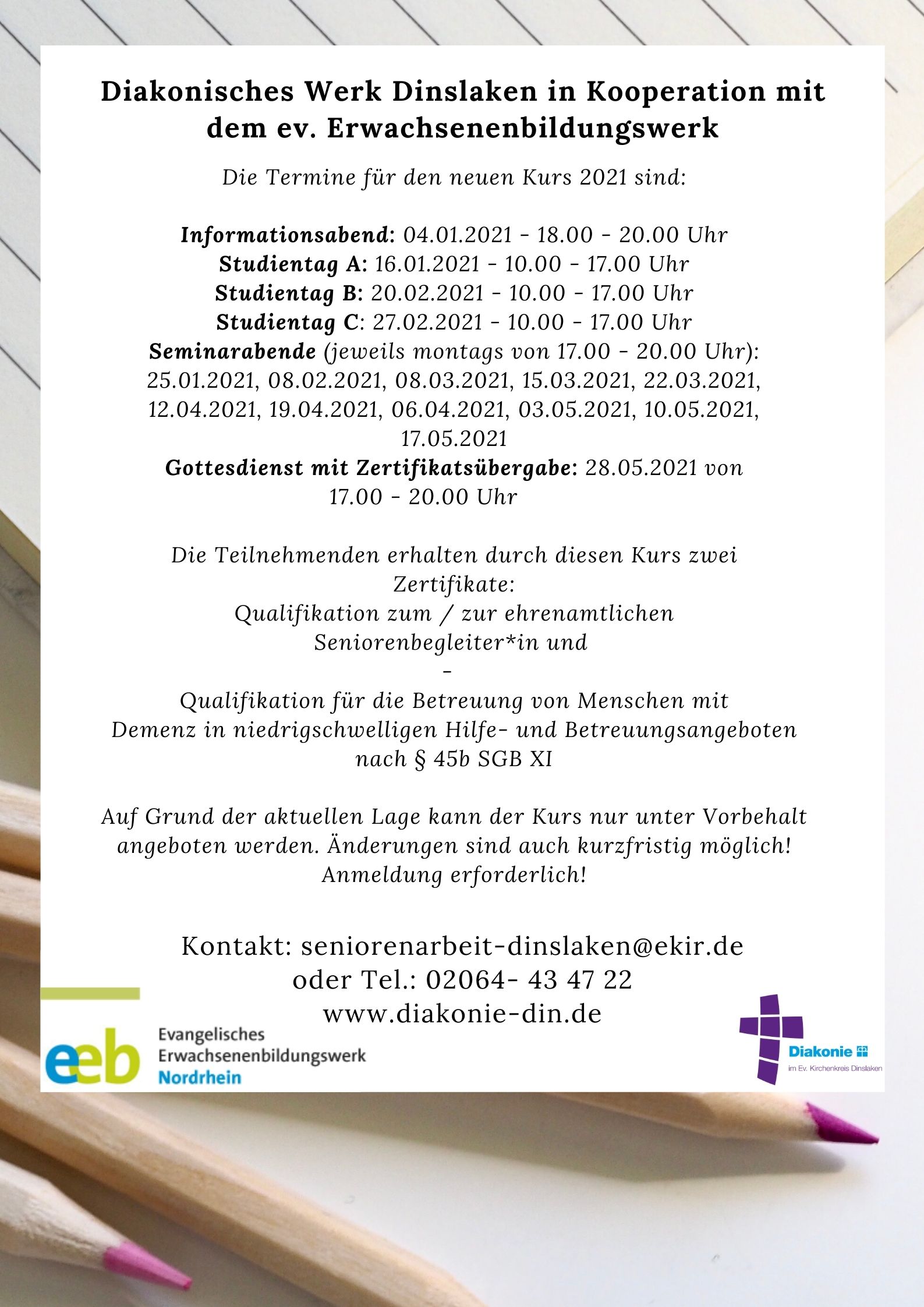 Das Diakonische Werk Dinslaken startet Ende Mai wieder einen neuen Ausbildungskurs für Interessierte, die sich als Seniorenbegleiter/in und als Demenzbegleiter/in qualifizieren möchten. Dieses Mal allerdings im Online-Format! Für diesen Kurs gibt es noch freie Plätze.