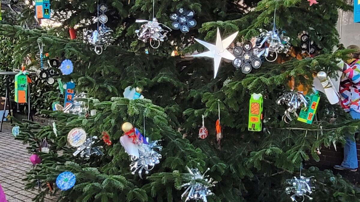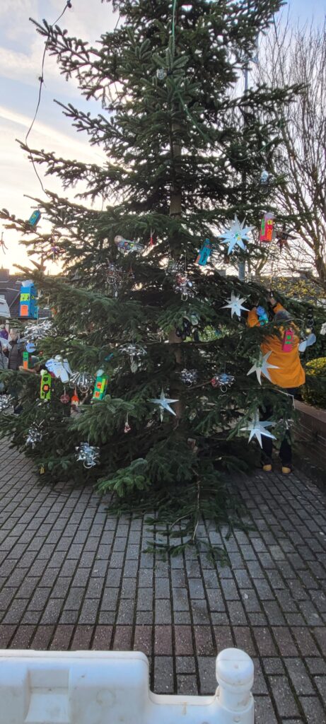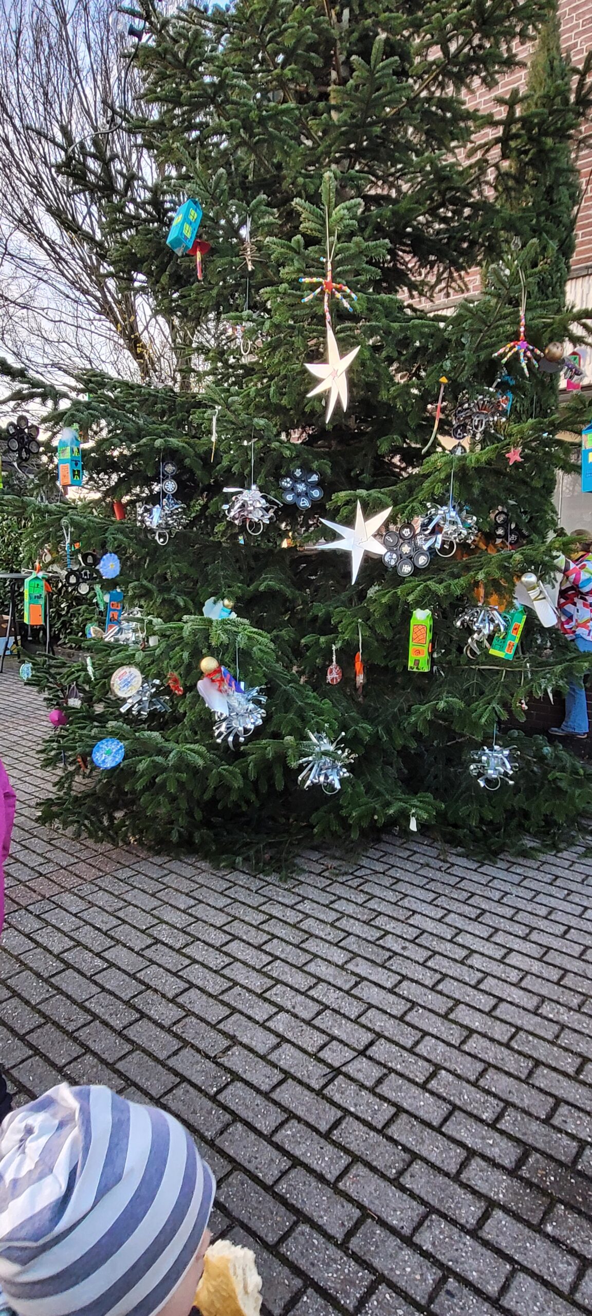 Die OGS der Otto-Pankok-Schule Drevenack kreierte dazu aus recycelten Materialien verschiedene Kunstwerke. Die Delegation aus Profibastlern schmückte dann mit Unterstützung vieler Eltern den Baum und wurde mit Weckmännern und Kinderpunsch versorgt.
