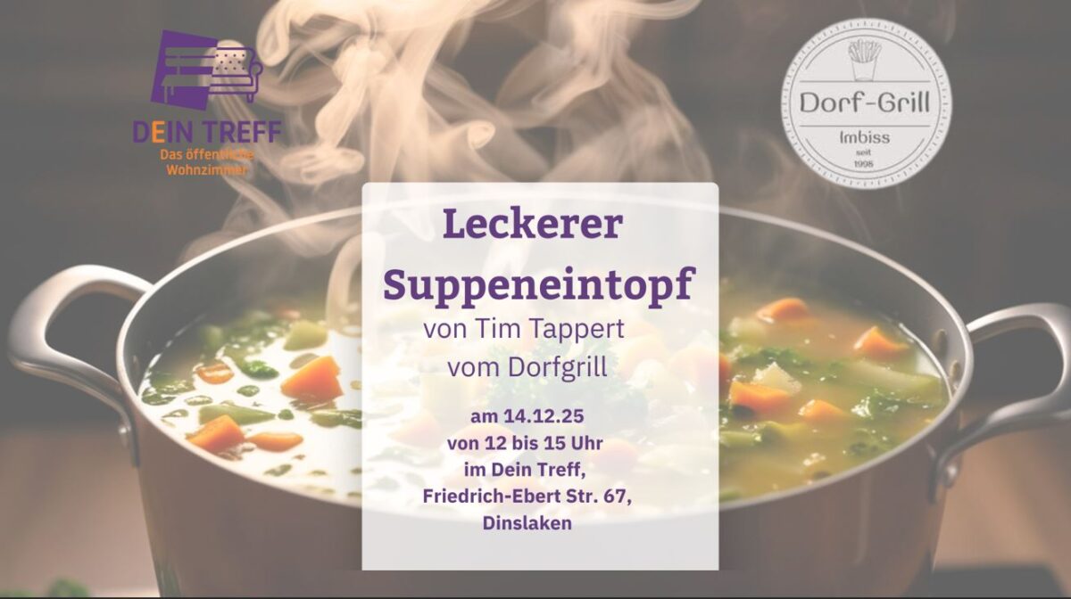 Das Team der Diakonie im Ev. Kirchenkreis Dinslaken öffnet das „Dein Treff – das öffentliche Wohnzimmer diesmal ausnahmsweise auch an einem Sonntag. Am 14.12.25 von 12 bis 15 Uhr schenkt Tim Tappert vom Hiesfelder Dorfgrill an der Friedrich-Ebert Str. 67 in Dinslaken kostenlos leckere Suppe aus. Wer mag, kann einfach vorbeikommen.